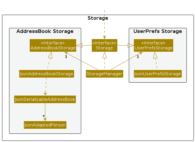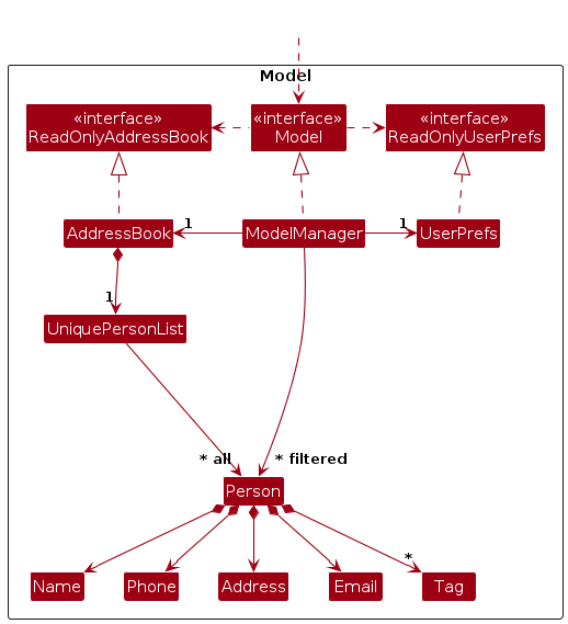 Person, Group and Company objects (which are contained in a UniquePersonList, UniqueGroupList and UniqueCompanyList object).Person, Group or Company objects (e.g., results of a search query) as a separate filtered list which is exposed to outsiders as an unmodifiable ObservableList<Person>, ObservableList<Group> or ObservableList<Company> that can be 'observed' e.g. the UI can be bound to this list so that the UI automatically updates when the data in the list change.UserPref object that represents the user’s preferences. This is exposed to the outside as a ReadOnlyUserPref objects.Model represents data entities of the domain, they should make sense on their own without depending on other components)API : Storage.java