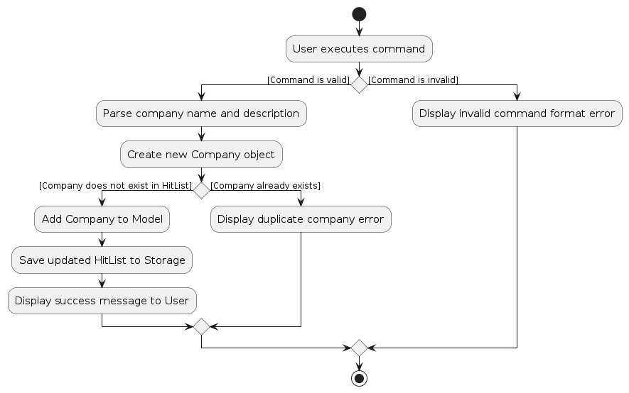 AddCompanyCommandParser#parse() — Parses the user input to extract the company name (indicated by the /c prefix) and the description (indicated by the /d prefix).AddCompanyCommand#execute() — Executes the logic to add the parsed company to the model.Model#addCompany() — Updates the HitList within the Model state with the newly created company.Given below is an example usage scenario and how the AddCompany mechanism behaves at each step.