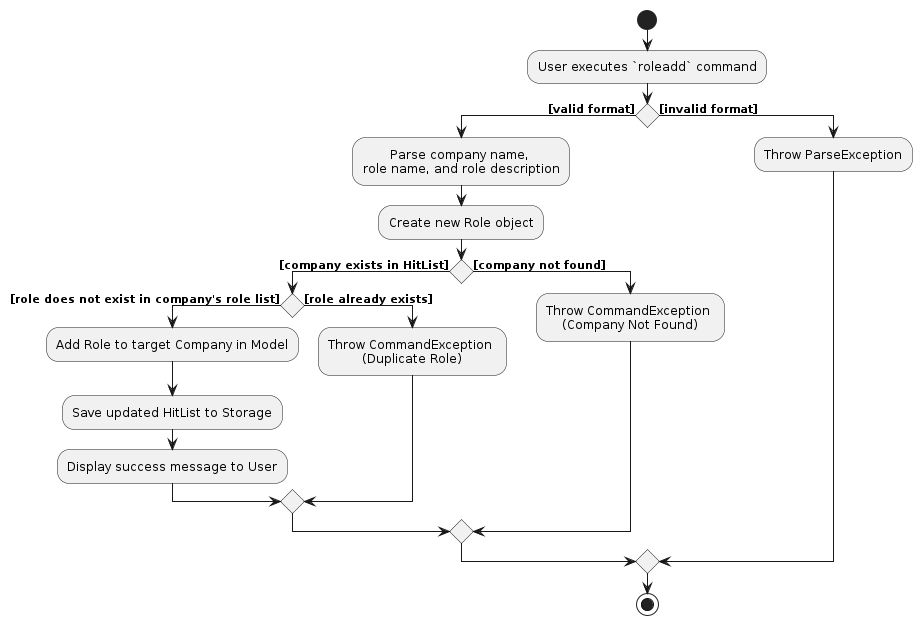 AddCompanyRoleCommandParser#parse() — Parses the user input to extract the target company (indicated by the /c prefix), role name (indicated by the /r prefix) and role description (indicated by the /d prefix).AddCompanyRoleCommand#execute() — Executes the logic to add the parsed role to the target company in the model.Model#addCompanyRole() — Updates the HitList within the Model state by adding the new role to the target company.Given below is an example usage scenario and how the AddRole mechanism behaves at each step.