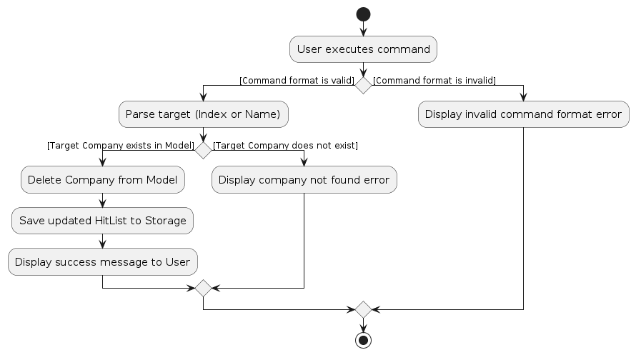 DeleteCompanyCommandParser#parse() — Parses the user input to determine if the deletion target is an index or a company name (indicated by the /c prefix).DeleteCompanyCommand#execute() — Executes the logic to verify the target's existence and remove it from the model.Model#deleteCompany() — Updates the HitList within the Model state by removing the specified company.Given below is an example usage scenario and how the DeleteCompany mechanism behaves at each step.