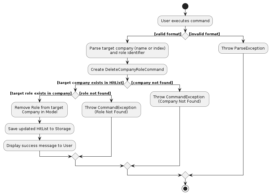 DeleteCompanyRoleCommandParser#parse() — Parses the user input to determine if the deletion target is an index or a role name (indicated by the /r prefix), as well as the target company (indicated by the /c prefix).DeleteCompanyRoleCommand#execute() — Executes the logic to verify the target's existence and remove it from the target company in the model.Model#deleteCompanyRole() — Updates the HitList within the Model state by removing the specified role from the target company.Given below is an example usage scenario and how the DeleteRole mechanism behaves at each step.